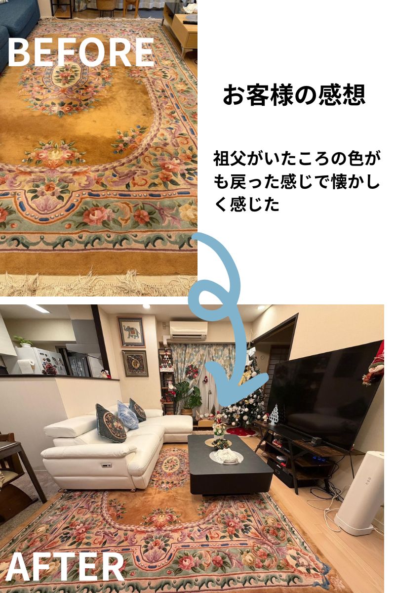 昔に戻り、クリーニング後の絨毯を眺めながら子供ながらに記憶していた色(そう言えばこんな色だったな)に戻り懐かしさも感じれました。この先の代(子供、孫)に引き継いでいけるよう