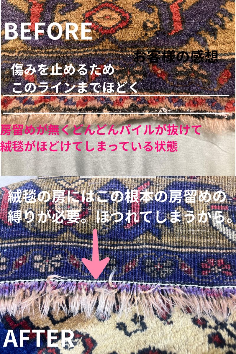 「フチの修理(エッジや房)ができるところを探していて、なかなか見つからなった。こちらではできるとの事で実際に持ち込んで、直接職人さんにも相談できたのでおねがいしました。」